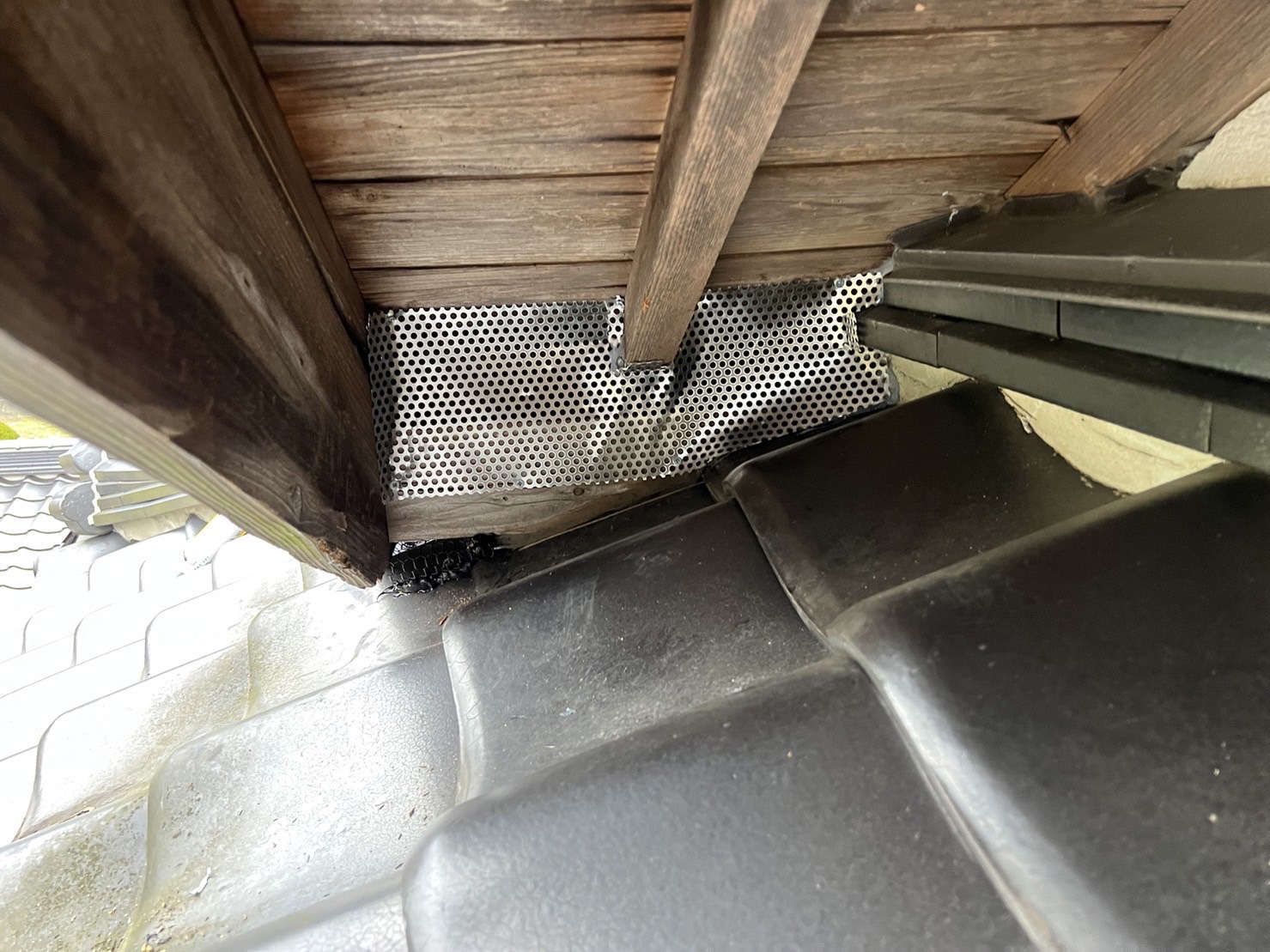 追い出し作業完了後、屋外にてイタチの侵入口となり得る箇所を全て確認し、侵入口封鎖工事へ移りました。O様邸は非常に大きな日本家屋で、屋根の作りが複雑になっており、塞ぐ箇所も非常に多く大変な作業となりましたが、全ての侵入口を封鎖し、その後塞ぎ漏れが無いかの確認を行いました。