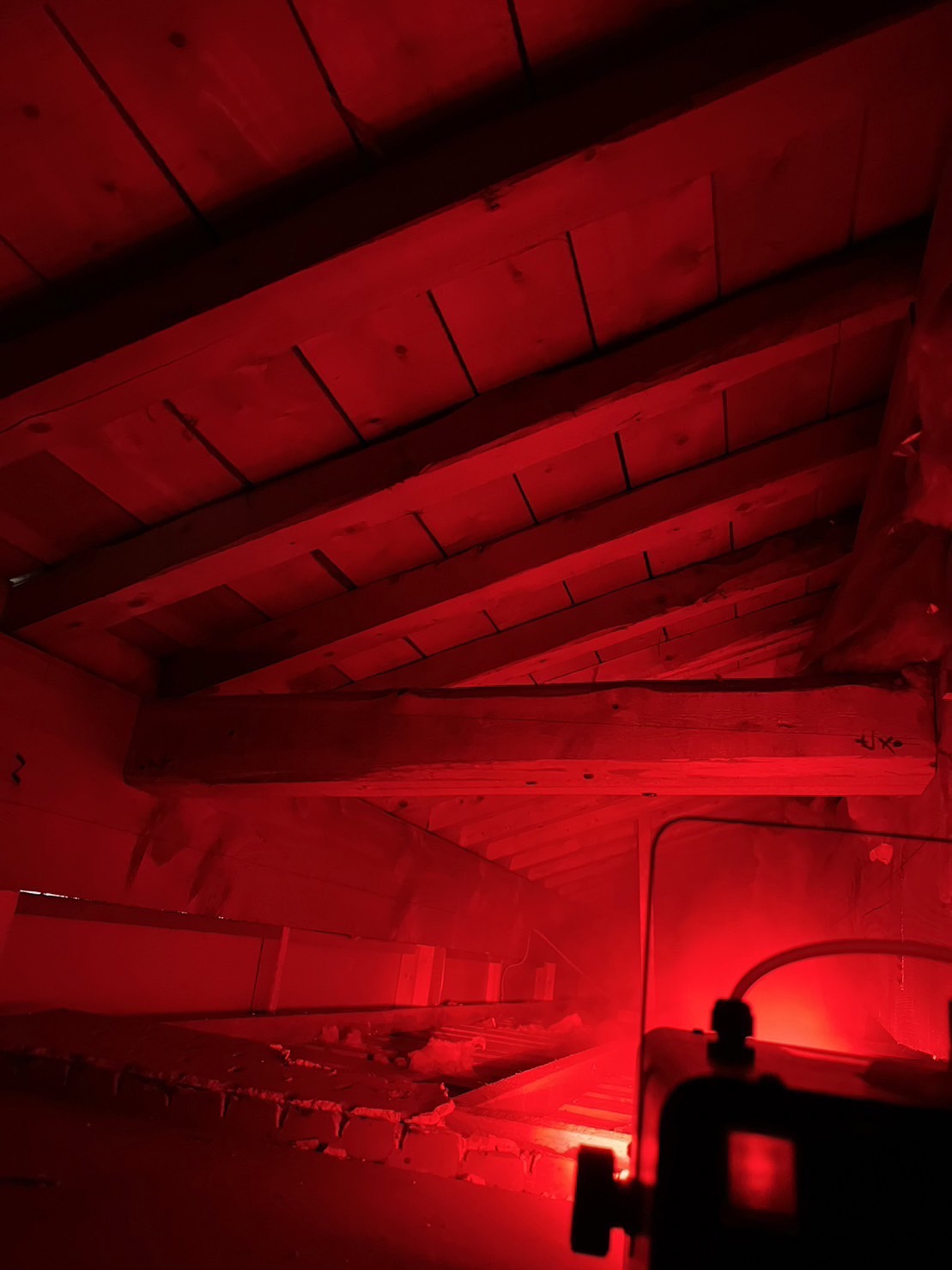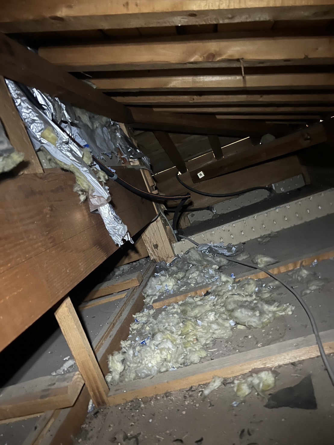 侵入口封鎖工事完了後、1階の天井裏1箇所にて、イタチに荒らされた断熱材を撤去し、発砲ウレタンを新設しました。