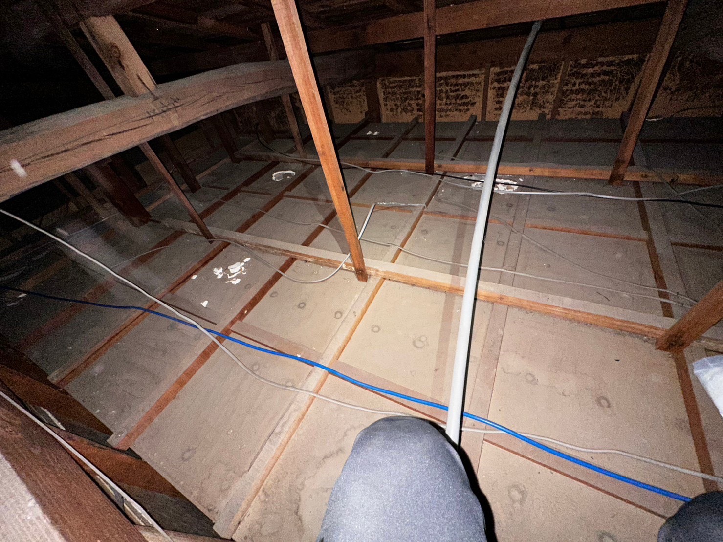 天井裏に入り糞清掃をさせて頂き、断熱材新設工事をさせて頂いた後、燻煙追い出し作業を行いました。