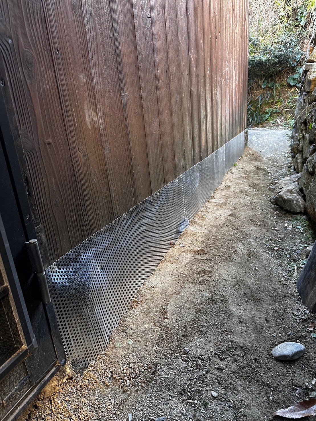 燻煙追い出し作業完了後外回りのネズミの侵入口になっている穴を全て弊社が使っております金網で隅々まで封鎖させて頂きました。