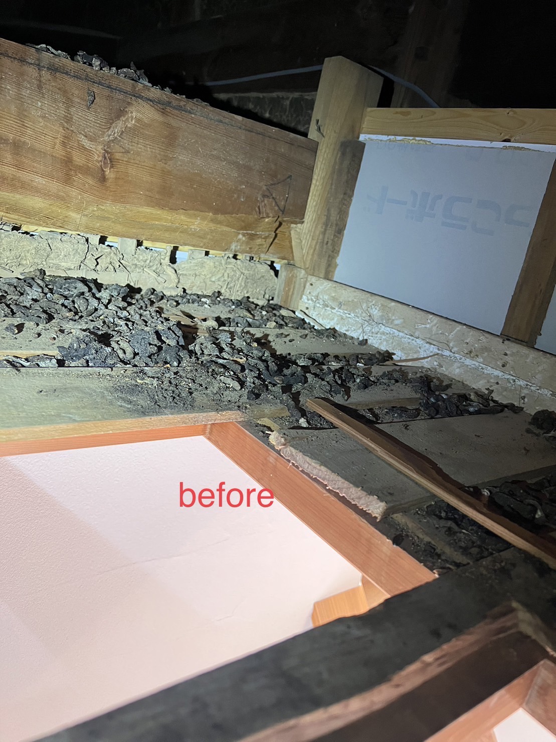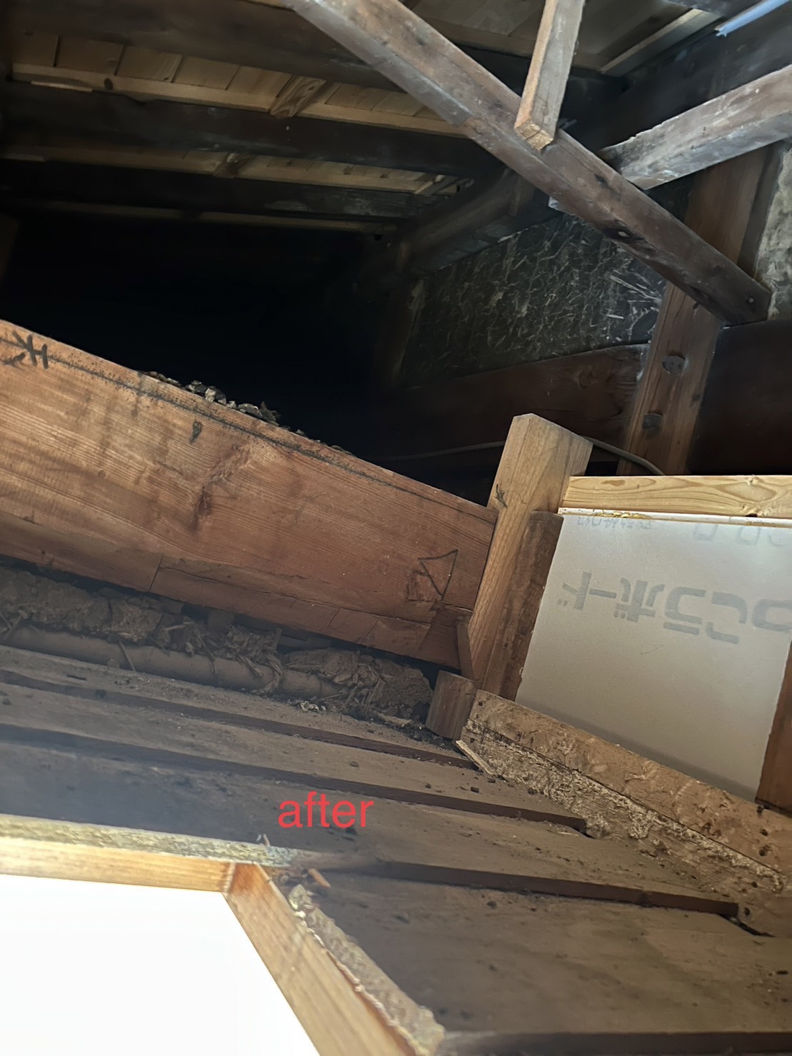 続いて、天井裏にある断熱材のなかで、糞や尿によって被害を受けた箇所の撤去と新設を行いました。