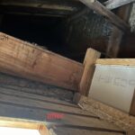 まずは1階2階の天井裏にて糞清掃を行いました。本日のお客様のお家は玄関の天井に大きなシミが出来てたことがきっかけで問い合わせを頂きました。そこの確認が、点検口からでは行えないため、玄関の天井を1部剥がし、確認と糞清掃を行いました。