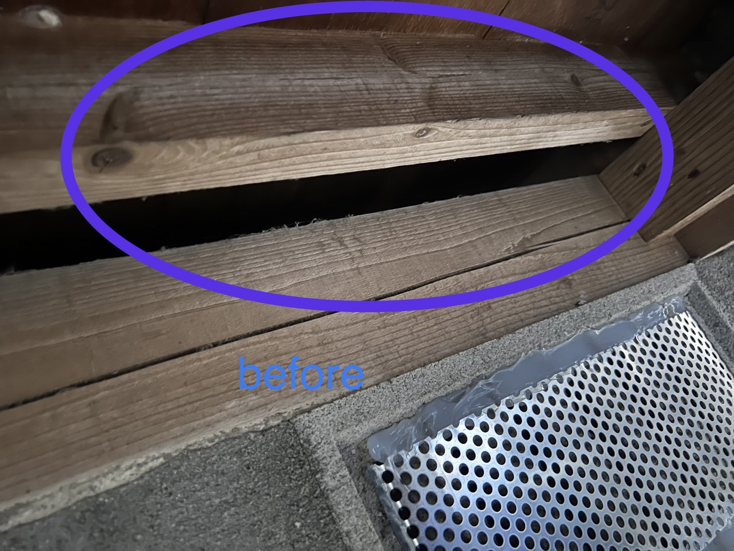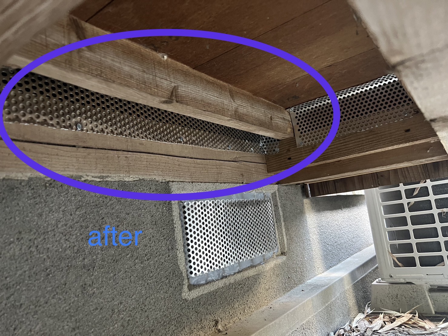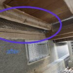 追い出し作業完了後に、外部の浸入口封鎖工事を行いました。床下通風口や瓦の重なり部分などかなり多くの箇所を塞ぎました。ハクビシンは身体能力が高く、垂直跳びでは1m以上飛ぶことができます。また、バランス能力も非常に優れており、電線などを渡ることもできます。