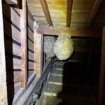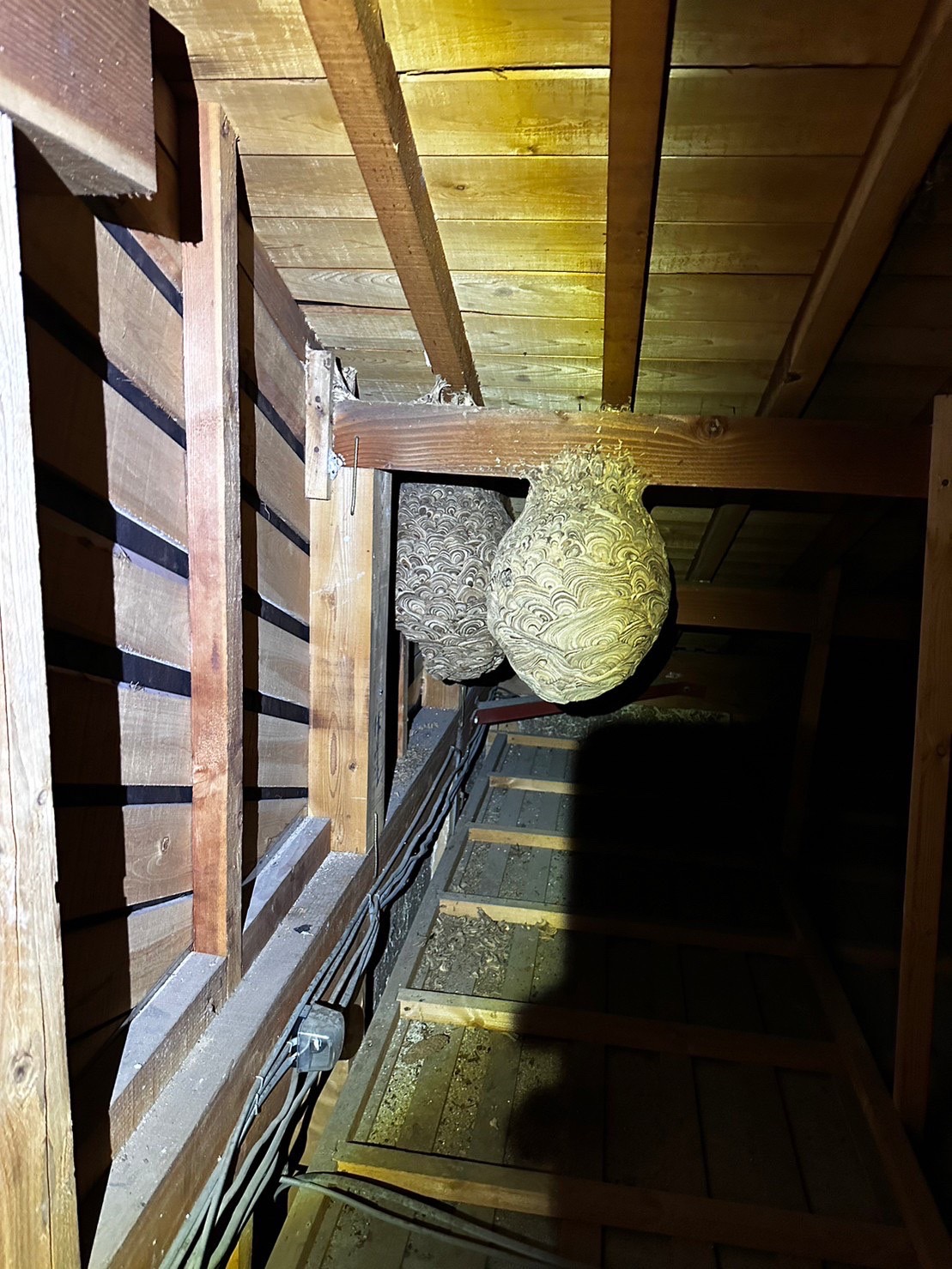 まずは点検工から天井裏に入り糞清掃をさせて頂いた後、スズメバチが3個巣を作っていたため撤去させていたき、燻煙追い出し作業を行いました。