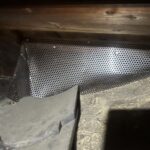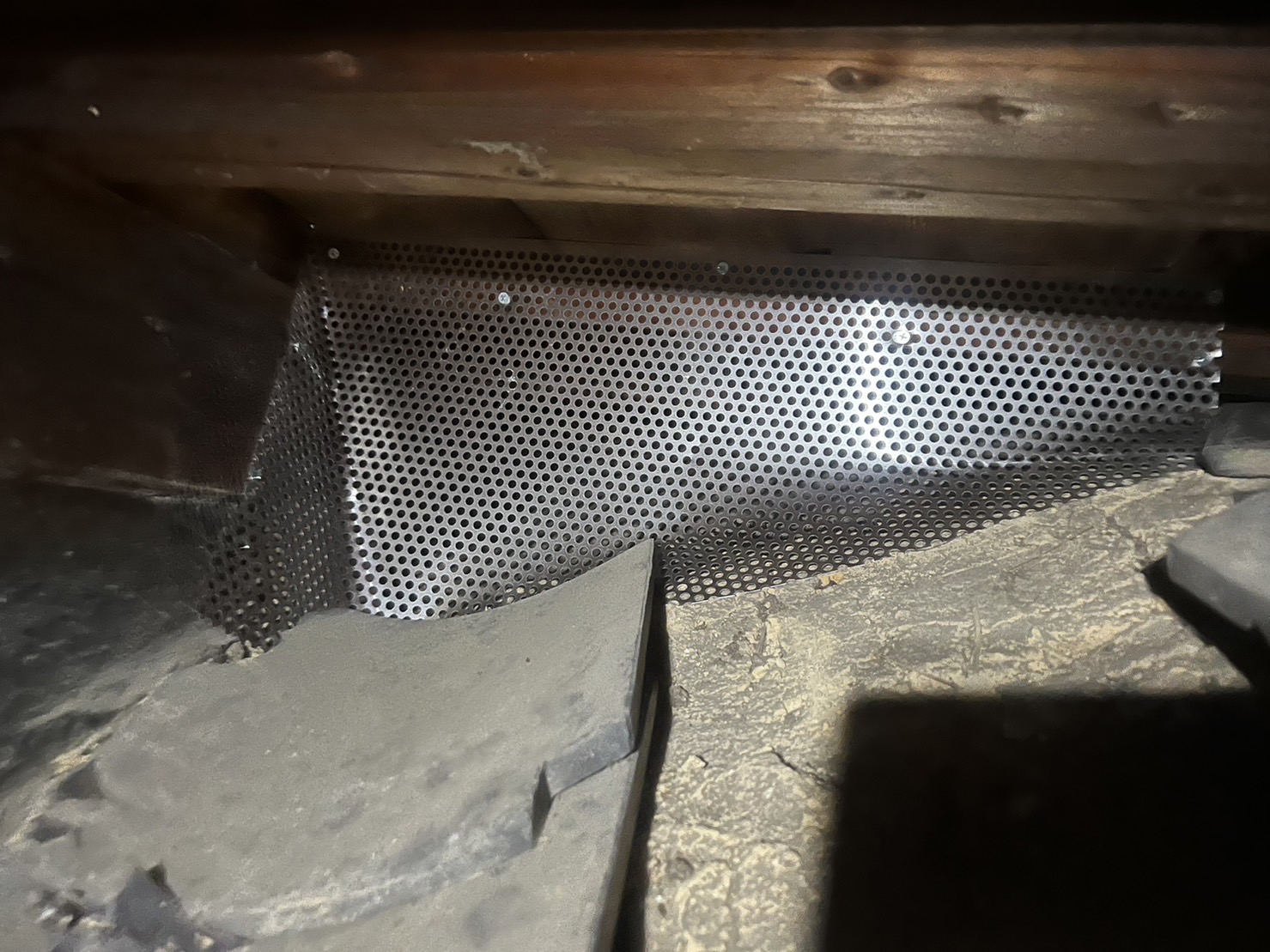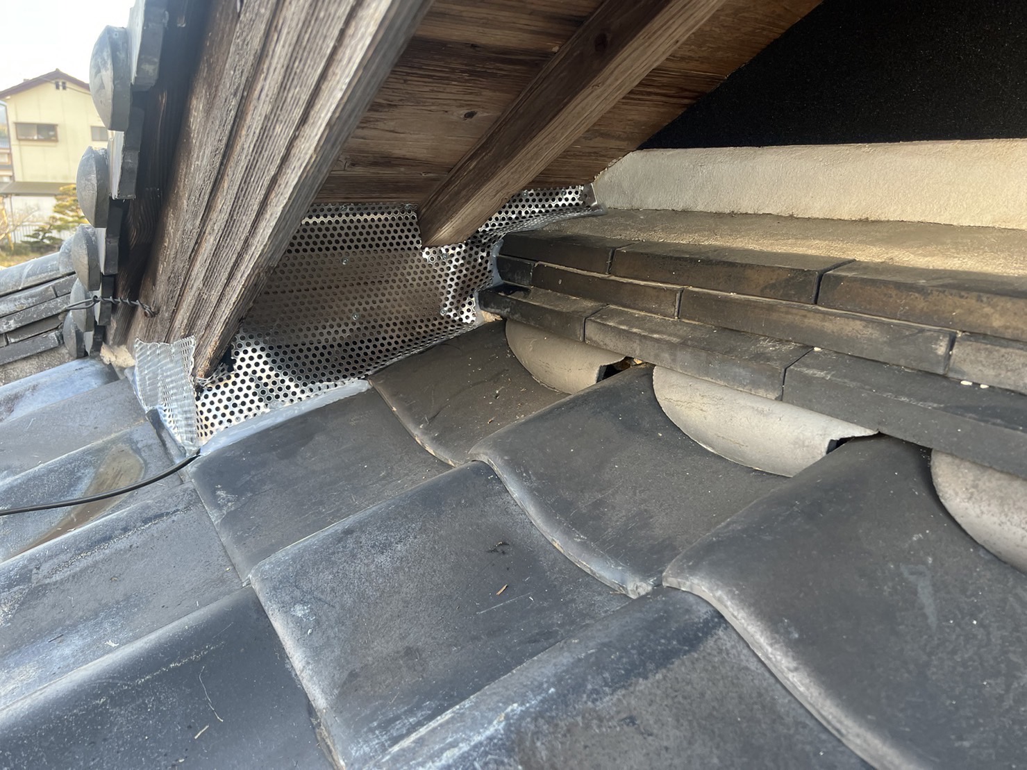 追い出し作業完了後、屋外にて侵入口を封鎖する工事をおこないました。今回のお家は床下が大きく開いていたり、入母屋の数が非常に多くありました。アライグマは鋭い爪をもち、とても力が強いため、新しい下地を作成し、パンチングメタルを用いて完全に封鎖致しました。