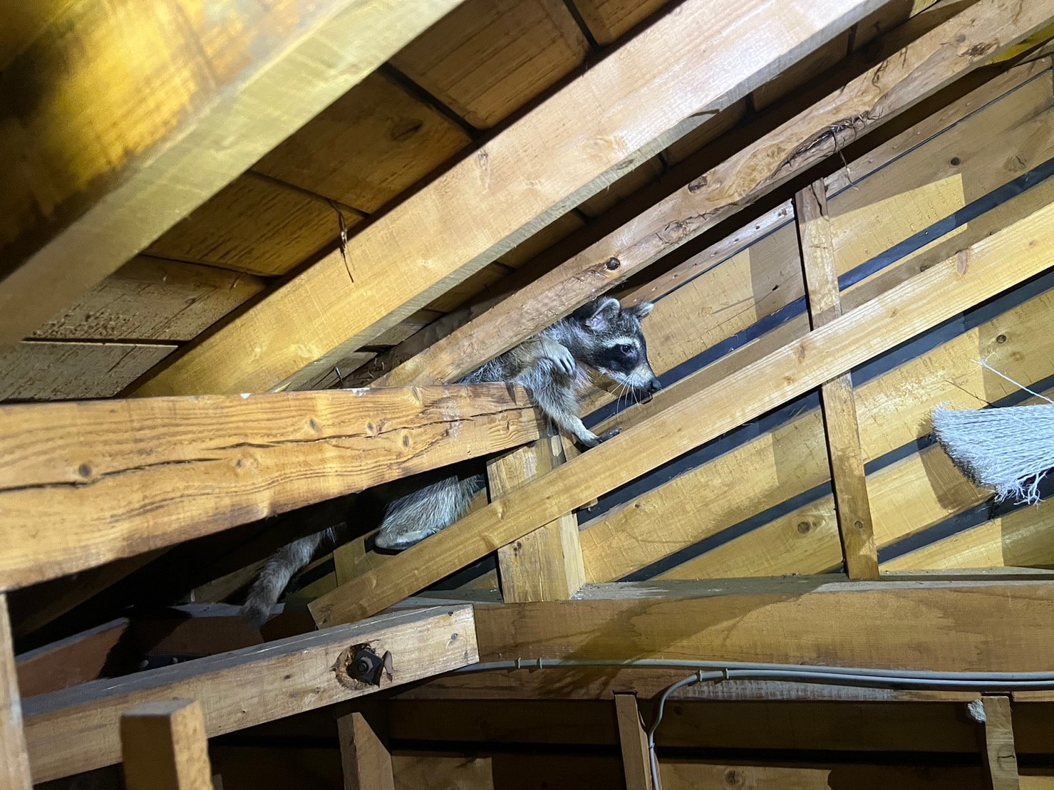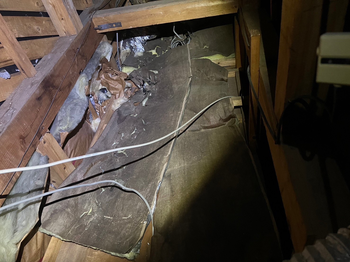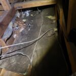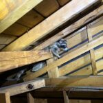 天井裏に入ると、アライグマの親と赤ちゃんが2匹いましたので外へ追い出し、糞清掃を行い、アライグマの被害がある断熱材を剥がし新しい物に取り替えた後に燻煙追い出し作業を行いました。