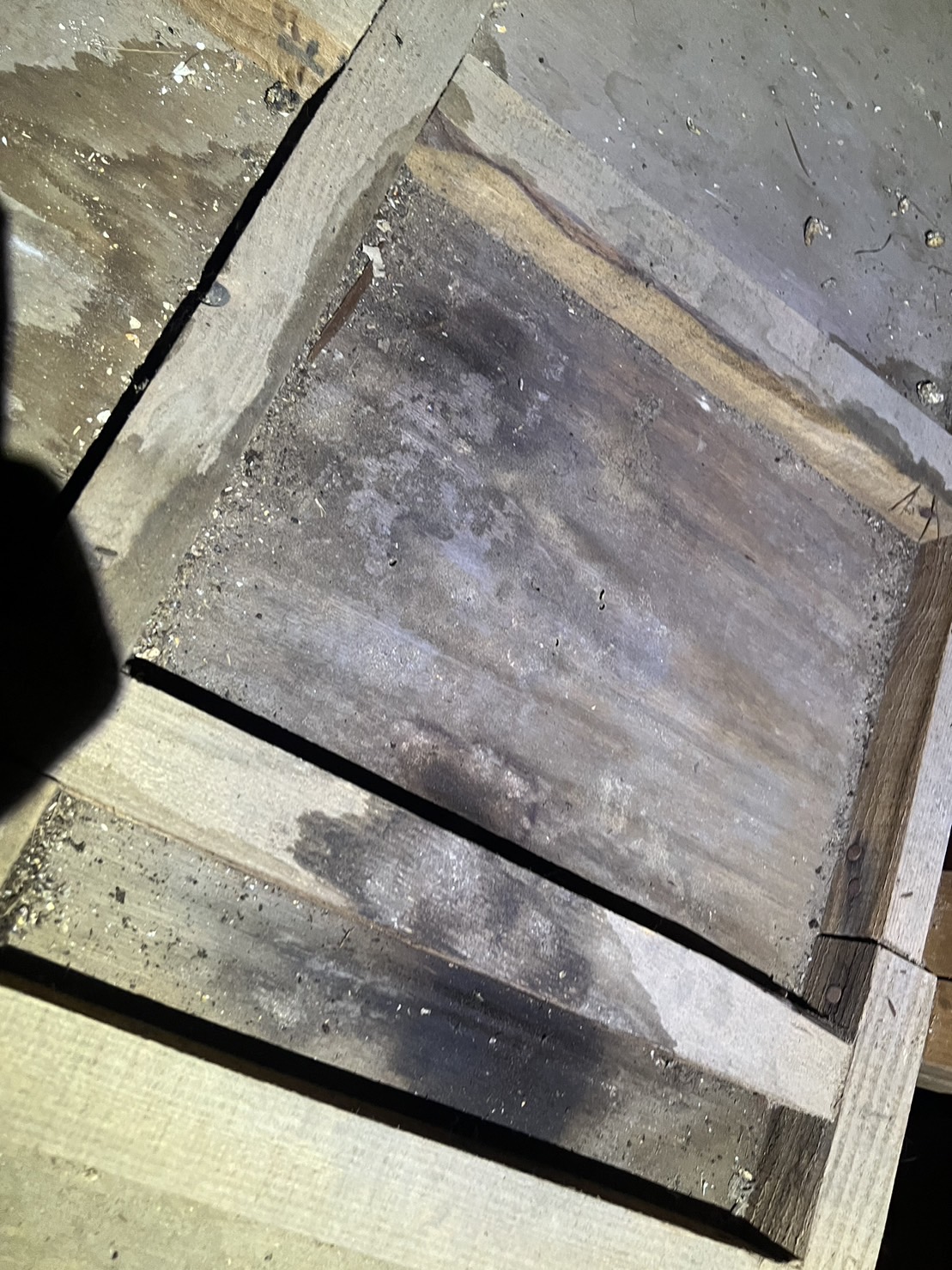天井裏にはアライグマの糞が大量にあり、一部天井に穴が開いていたため、簡易的な修復を行いました。
