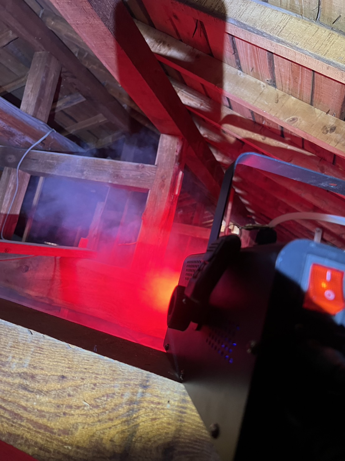 糞清掃完了後、天井裏、床下で追い出し作業を行いました。追い出し作業では、業者専用の非常に強力な薬剤使います。それを、専用の機械に入れて煙状にすることで、天井裏や床下だけでなく、壁の隙間に潜む動物へも強い効果を示すことができます。