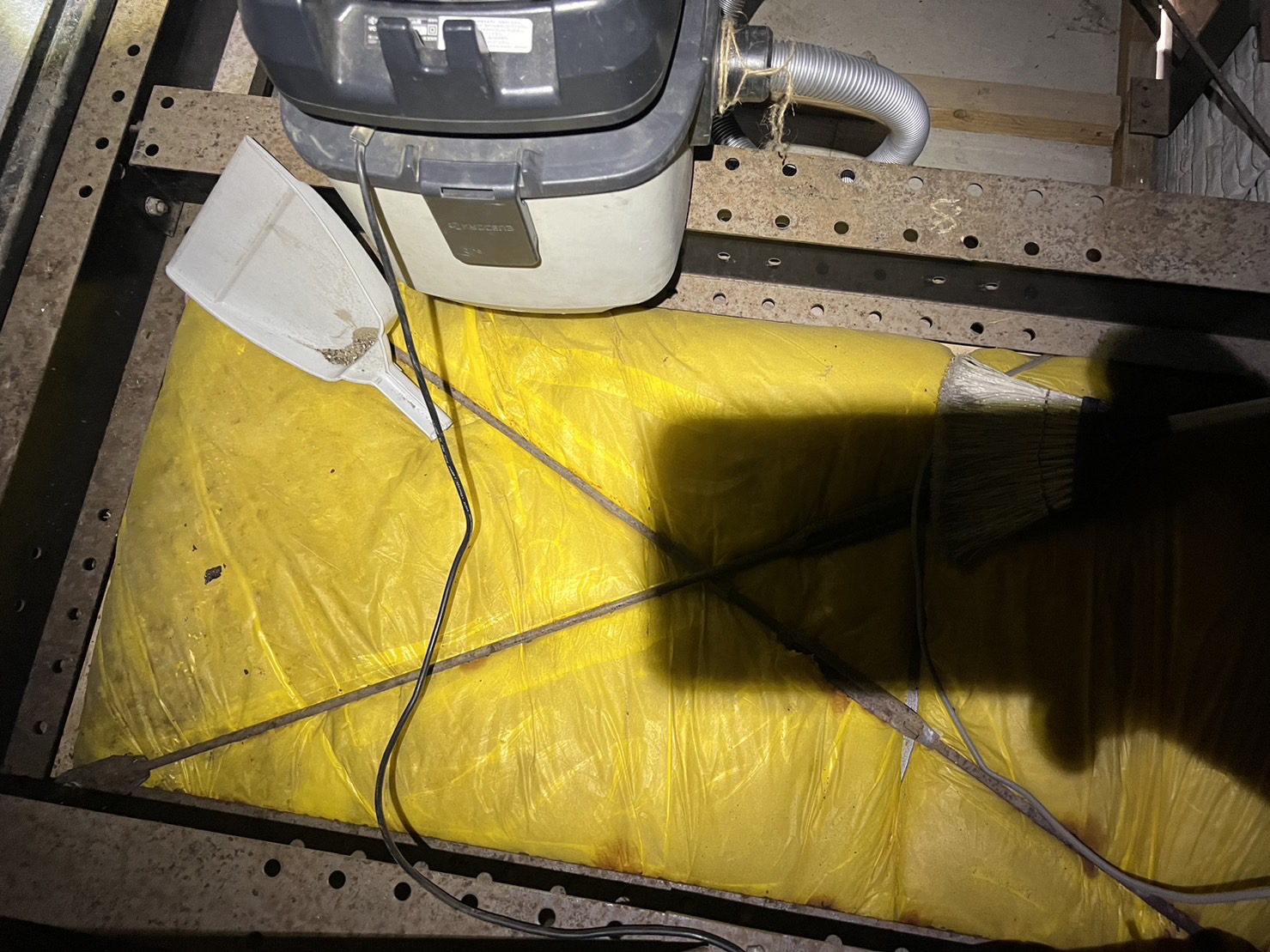 朝イチで1階と2階の天井裏に入り、糞清掃を行いました。1階天井裏のメイン侵入口付近には大量の糞があり、積み重なったものが塊のようになっておりました。