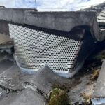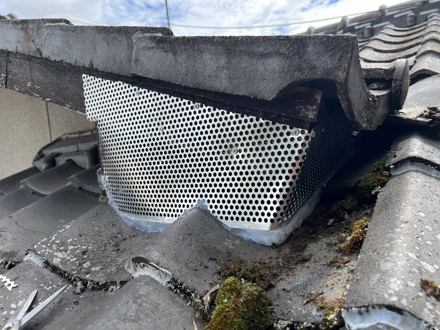 封鎖箇所は、2階屋根の重なった所2箇所と1階の入母屋の両脇が空いていたのでパンチングメタルとコーキングを使用して塞ぎました。