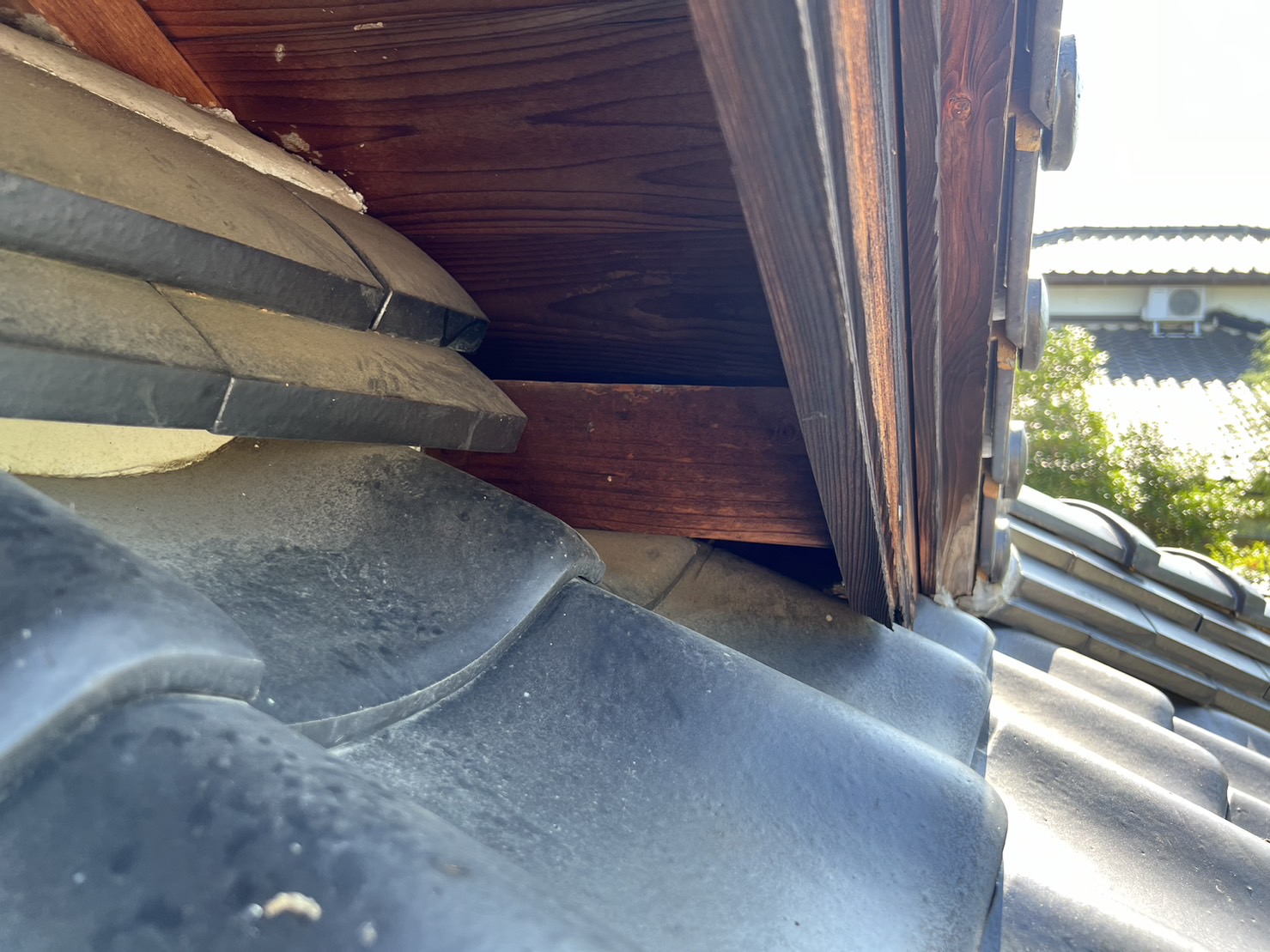 メインの侵入口は玄関の上にあった入母屋でした。その他、瓦と瓦の重なり部分、板金板と瓦の隙間が封鎖箇所でした。