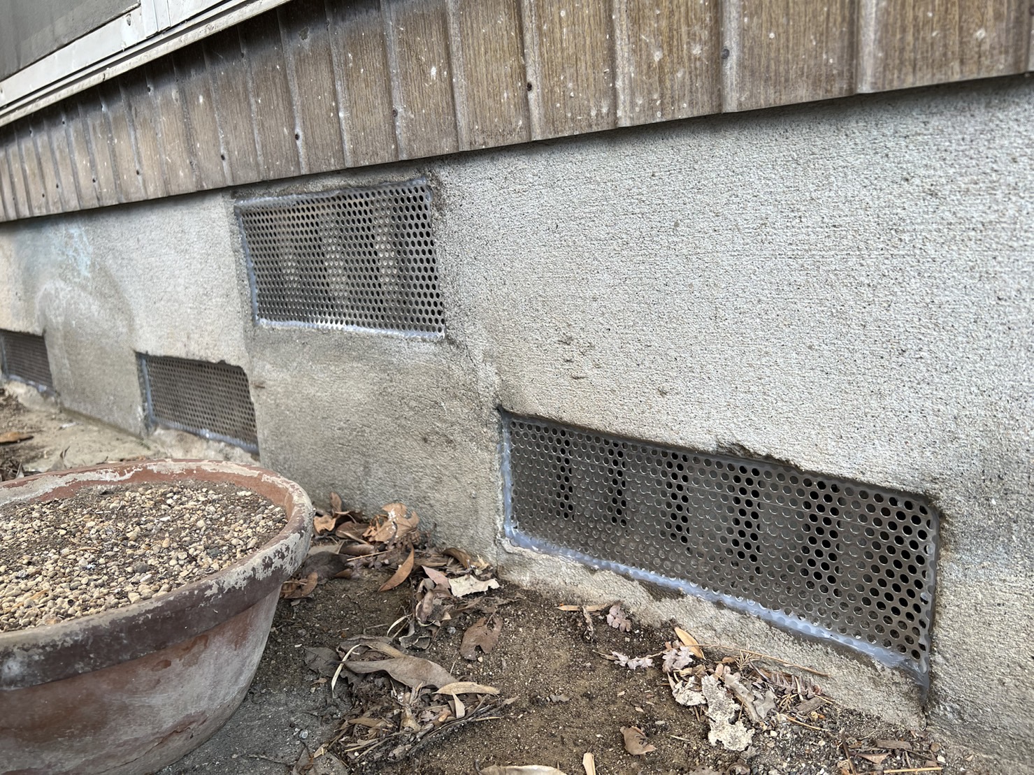 それらを強度と通気性を持たせたパンチングメタルとコーキングを使用して封鎖させて頂きました。また、S様邸の基礎部分の通風口は一般家庭と比べて隙間が大きく、ネズミはもちろんイタチも容易に入れる程の大きさでした。ですので今回の対策工事でイタチとネズミの侵入はもちろん、その他害獣の侵入を防ぐ事ができました。